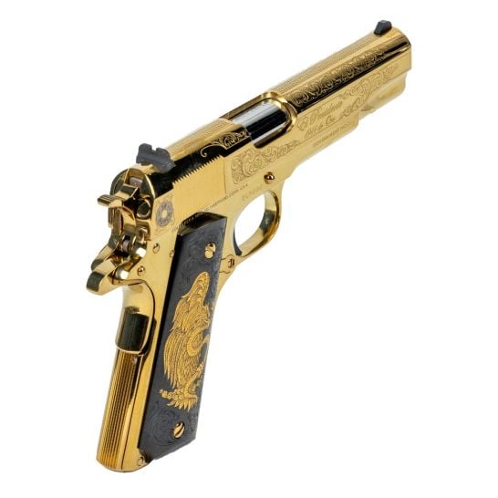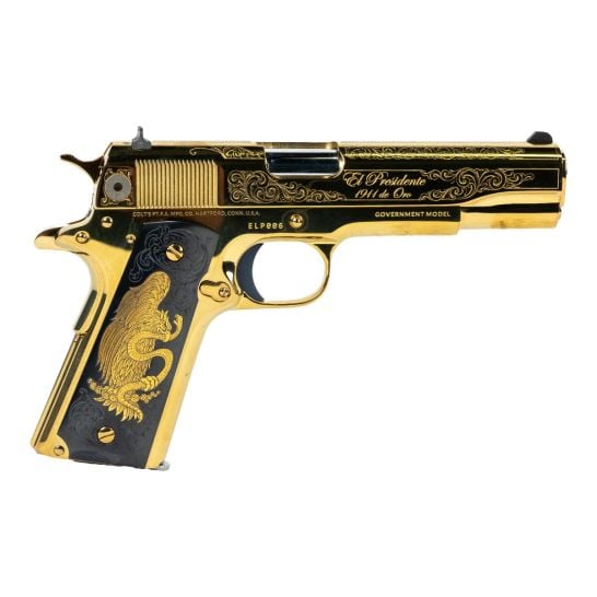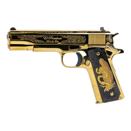 The Limited Edition Colt 1911 El Presidente De Oro stands as the pinnacle of collector’s treasures. Its slide and frame gleam with a high-polished gold titanium nitride finish, embellished with elaborate scroll and lace accents featuring “El Presidente” above “1911 de Oro,” along with the Colt logo, presidential crest, Rampant Colt, and silver embossed 38 Super casing. Adding to its opulence, the custom blued metal engraved grips are adorned with a 24-carat gold plated Mexican Coat of Arms.