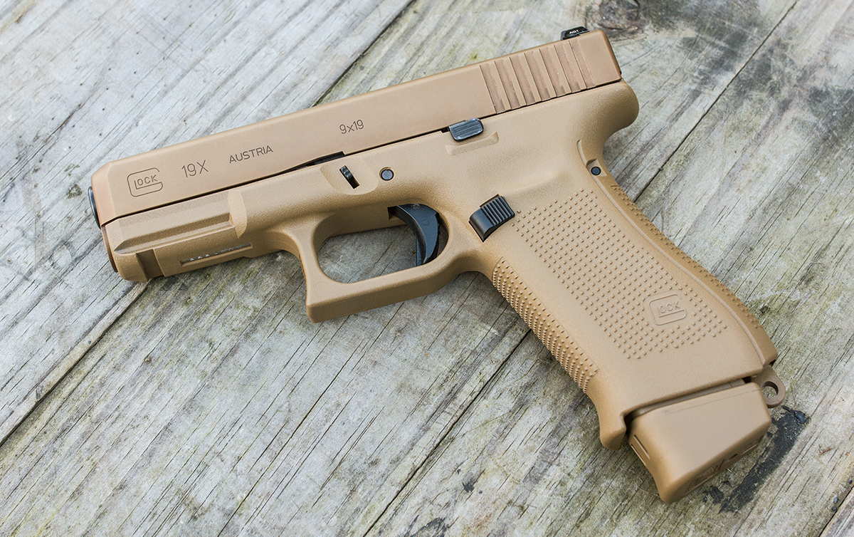 Glock 19X is a “crossover” pistol combining the best features of Gen 5 Glocks. It has Glock 17 full-size grip and Glock 19 compact slide and barrel. This makes it more comfortable to use by shooters with large (or normal) sized palms, without magazines with extended floorplates.