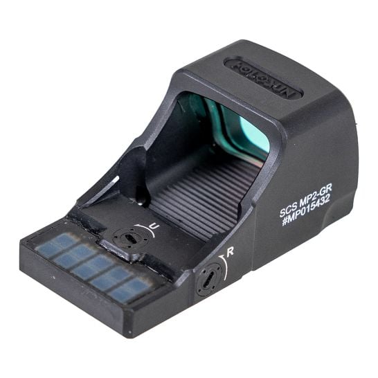 The SCS-MP2-GR (Solar Charging Sight) fits the Smith & Wesson M&P-M2.0 full size, 9mm & 40S&W handguns (will not fit 1.0 or Shield models). It is designed to attach directly to the slide without an adapter plate and uses our innovative solar charging system with multi-directional light sensors to automatically adjust brightness in dynamic situations. The SCS can potentially operate indefinitely using an internal, rechargeable 20,000-hour power reserve meaning under even moderate exposure to bright light, you will never need to change batteries again. The SCS also includes an intensity override function which locks the optic into a high brightness mode for 30 minutes and a low power indicator, which will signal if charging is needed upon system start up. Additionally, our Multi-Reticle System (MRS) displays a 32MOA Circle or a 2MOA dot or both.