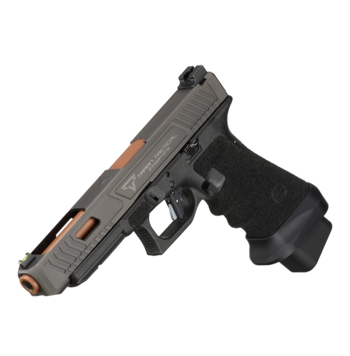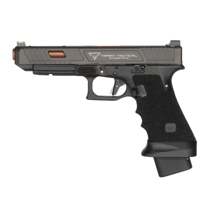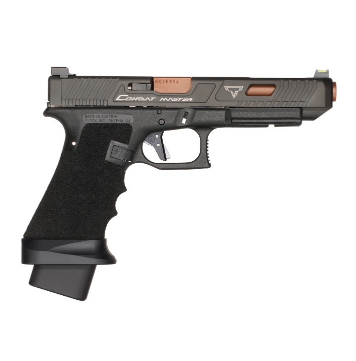 Taran Butler was the first Champion in USPSA history to ever win titles using a Glock, and did it in under 12 months! He also holds the longest winning streak, across multiple divisions, in GSSF history. Featuring a recontoured grip, flared magwell (for easier reloads), custom porting, competition trigger, and green fiber optic front sight; the current Combat Master you see before you is the result of Taran’s legacy of innovation with the Glock platform.