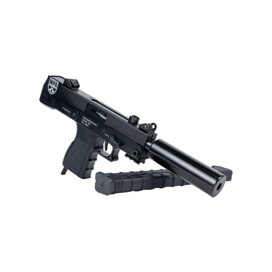 MasterPiece Arms strives for total innovation. This Defender 9mm handgun is the traditional top cocking model with a 5.5″ threaded barrel, a lever safety selector, 30-round magazine, and a Cerakote finish. It comes with a polymer carrying case.