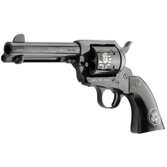 The Pietta 1873 Trump Revolver is chambered in .45 Colt, a caliber known for its power and versatility. The revolver is constructed with a robust frame and a 4.75″ barrel, providing a balanced feel and precise accuracy. The revolver’s black finish adds to its rugged appearance, making it a standout piece in any collection.