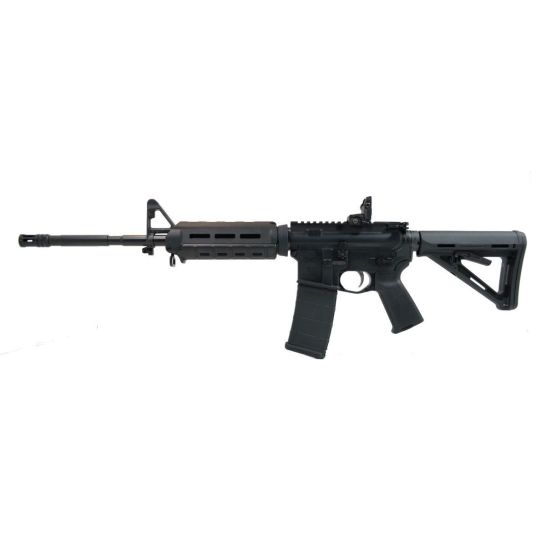 Barrel: Chrome Moly steel. Chambered in 5.56 NATO, with a 1:7 twist rate, M4 barrel extension, and a carbine-length gas system. Barrel is finished off with a black Magpul MOE Carbine-Length handguard, F-Marked gas sight base, and an A2 flash hider.