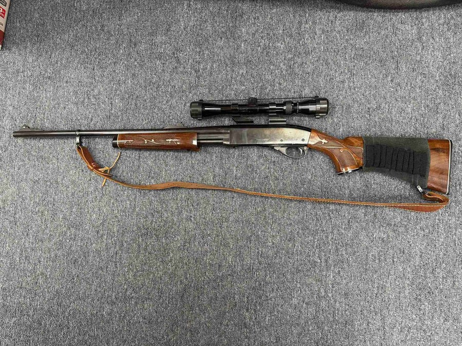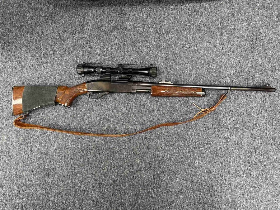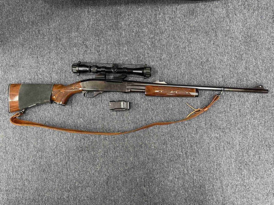 This pump action rifle has a 22in barrel with a 3-9x scope. It has wooden furniture and a sling.