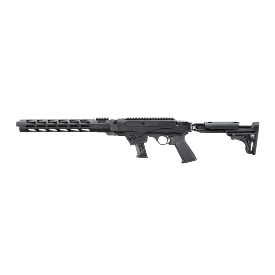 CNC-milled handguard that is Type III hard-coat anodized aluminum for maximum durability, with Magpul M-LOK accessory attachment slots on all four sides for easy mounting of M-LOK-compatible rails and accessories. Factory-installed, barrel-mounted picatinny rail allows for the forward mounting of optics. Interchangeable magazine wells for use of common Ruger and Glock magazines. Ships with SR-Series/Security-9 pistol magazine well installed and an additional magazine well accepting Glock magazines is included*.Easy takedown enables quick separation of the barrel/forend assembly from the action for ease of transportation and storage. Takedown is as simple as locking the bolt back and verifying that the riQe is unloaded, pushing a recessed lever, twisting the subassemblies and pulling themapart. Dead blow action features a custom tungsten dead blow weight that shortens bolt travel and reduces felt recoil and muzzle rise. Bolt is machined from heat treated, chrome-moly steel to ensure strength, structural integrity and durability. Reversible magazine release and reversible charging handle to support left- or right-handed use or one-handed control manipulation while maintaining a proper Tring grip*.Cold hammer-forged, chrome-moly steel barrel with ultra-precise riQing provides exceptional accuracy and longevity. The heavy contour barrel provides consistent accuracy, while barrel Quting sheds unnecessary weight and allows for quick handling. Threaded barrel with included thread protector allows for use of standard muzzle accessories. Chassis system features a Qared magwell for improved magazine reloading capabilities as well as integrated, rear-mounted QD cups. The reversible folding stock, with adjustable length of pull, is compatible with both AR-pattern and Picatinny rail-mounted aftermarket accessory stocks. Ergonomic pistol grip features an extended trigger reach for more precise trigger control. Glass-Tlled polymer chassis system, with integrated rear 7075-T6 aluminum picatinny rail, allows for the mounting of standard AR grips and picatinny rail-mountable stocks or extensions. Light, crisp trigger pull with minimal overtravel and positive reset utilizing proven 10/22 trigger components. CNC-machined from an aerospace-grade 7075-T6 aluminum billet, the receiver includes an integrated Picatinny-style rail and is Type III hard-coat anodized for maximum durability. Also includes: one, SR-Series or Security-9 pistol magazine and hex wrenches for disassembly of the chassis and aluminum handguard, as well as removal of the charging handle