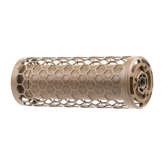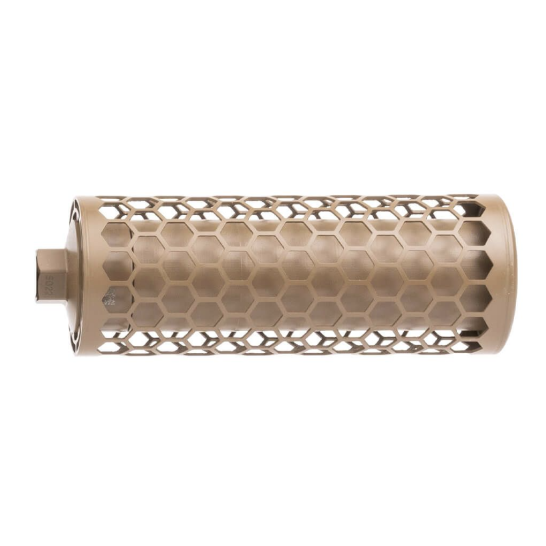 The direct thread suppressor is shielded by a detachable titanium hexagonal heat shield lowering the system’s thermal signature and increasing maneuverability. The shield was specifically designed to reduce the likelihood contact of burns when in dynamic situations and accommodate rapid transport in mission critical scenarios.