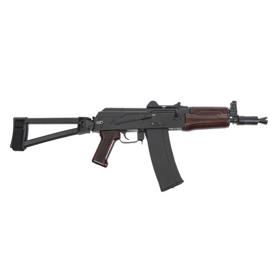 The Soviet Arms AKS-74U “Krinkov” pistol features a side folding rear trunnion, hinged dustcover, and short barrel for the most compact AK PSA has offered to date. This pistol is equipped with a black triangle side folding pistol brace, hinged dustcover with integrated rear sight, and plum gloss wood furniture. The original AKS-74U was adopted in 1979 to bridge the gap between a sub gun and a full-length rifle. This Soviet Arms AKS-74U is chambered in 5.56×45 and still maintains all the charm and aesthetic of the original 5.45x39mm Krinkov, but in an easier to obtain caliber.