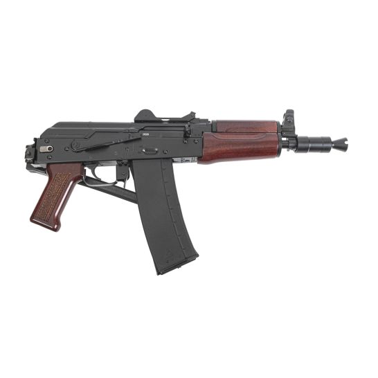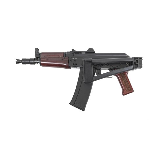 The Soviet Arms AKS-74U “Krinkov” pistol features a side folding rear trunnion, hinged dustcover, and short barrel for the most compact AK PSA has offered to date. This pistol is equipped with a black triangle side folding pistol brace, hinged dustcover with integrated rear sight, and red wood furniture. The original AKS-74U was adopted in 1979 to bridge the gap between a sub gun and a full-length rifle. This Soviet Arms AKS-74U is chambered in 5.56×45 and still maintains all the charm and aesthetic of the original 5.45x39mm Krinkov, but in an easier to obtain caliber.
