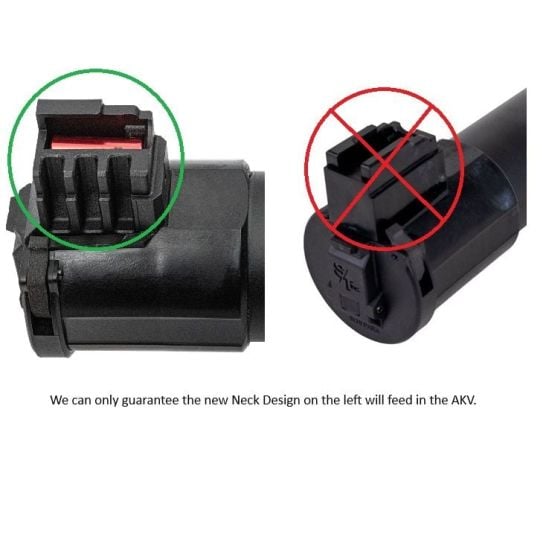 IMPORTANT: The “Stizon” AK-V is designed to function with the newer-style Stizon magazine feed lips. Please refer to the image above for reference—the feed ramps circled in green are compatible. We cannot guarantee proper function with the feed ramp style circled in red.