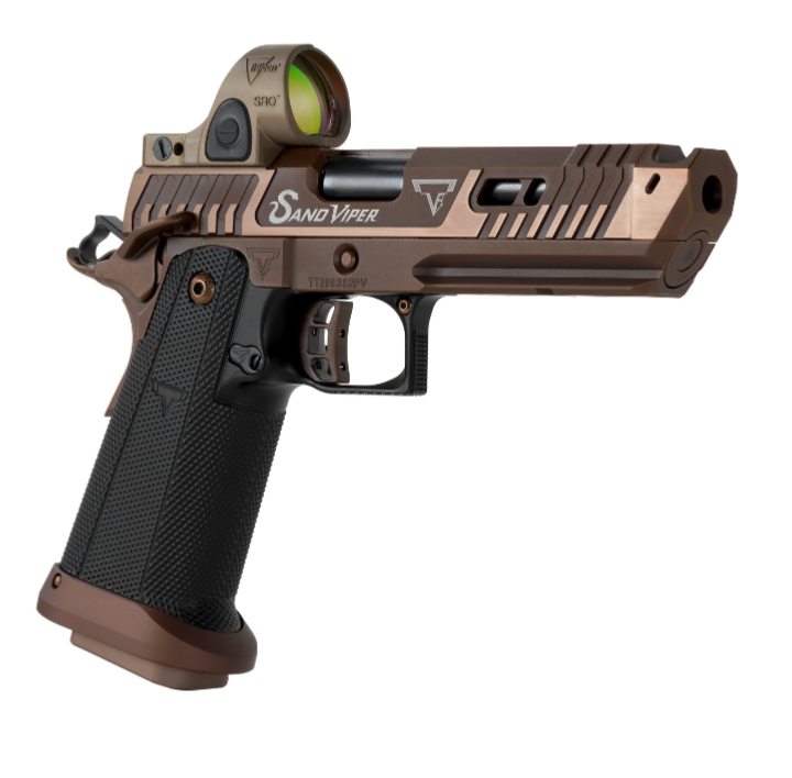 The TTI Sand Viper was designed to be the ultimate 2gun/3gun pistol. This firearm runs flawlessly with any factory or handloaded ammunition. With its extremely flat shooting compensator and low bore axis optic cut, point of aim will be nearly dead on at every distance from 5 yards to 50! This gun is already the sickest serpent on the planet holding the overall win at the USPSA 2gun nationals. Unlike many other 2011s, the fit and finish is like nothing you’ve ever held. These guns are tailor designed to fit and feel exactly like the guns Taran has used building his legacy. The memory groove is blended seamlessly to activate immediately. For any shooter this is the most astonishing handgun you’ll ever hold. Be careful of its hidden fangs!
